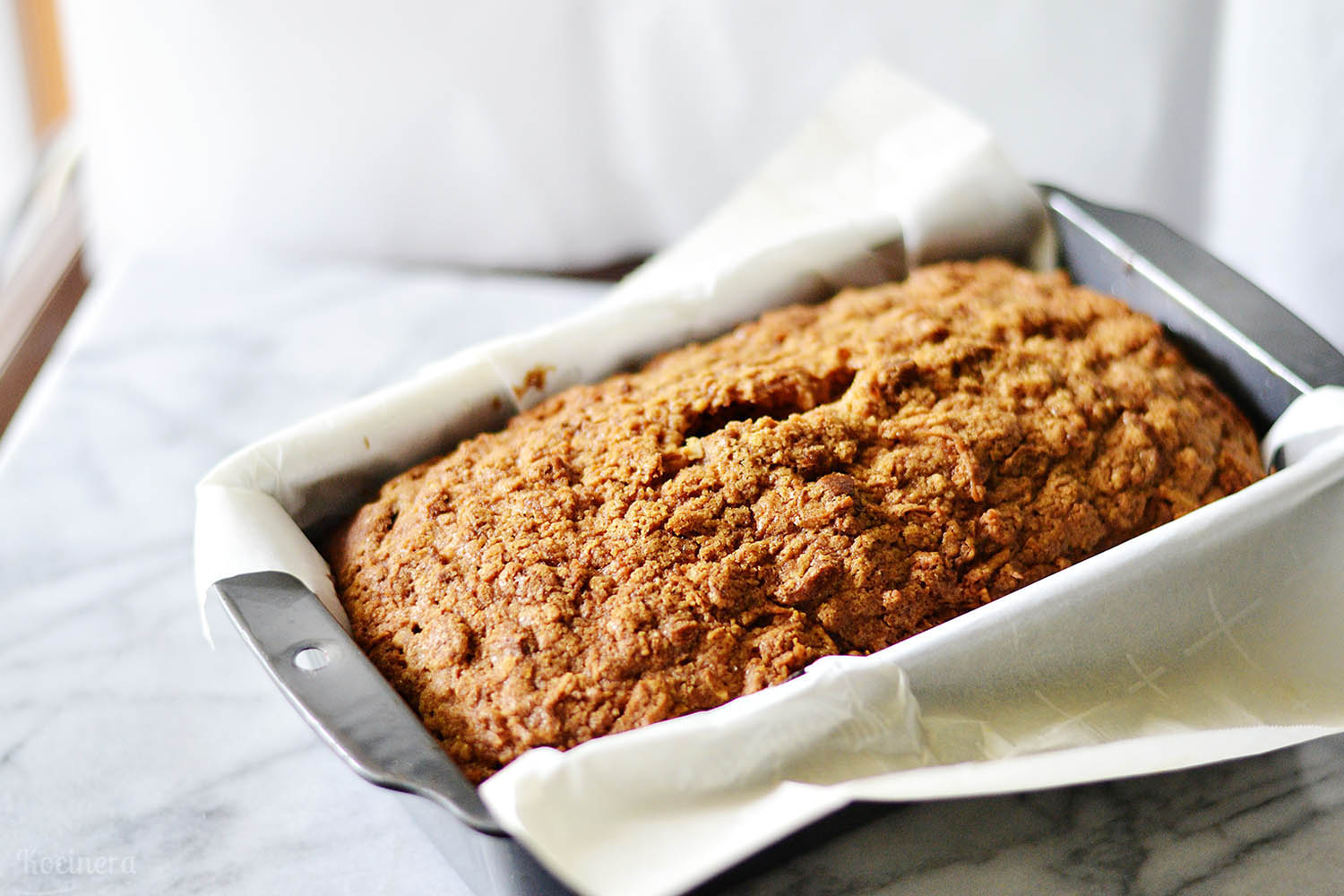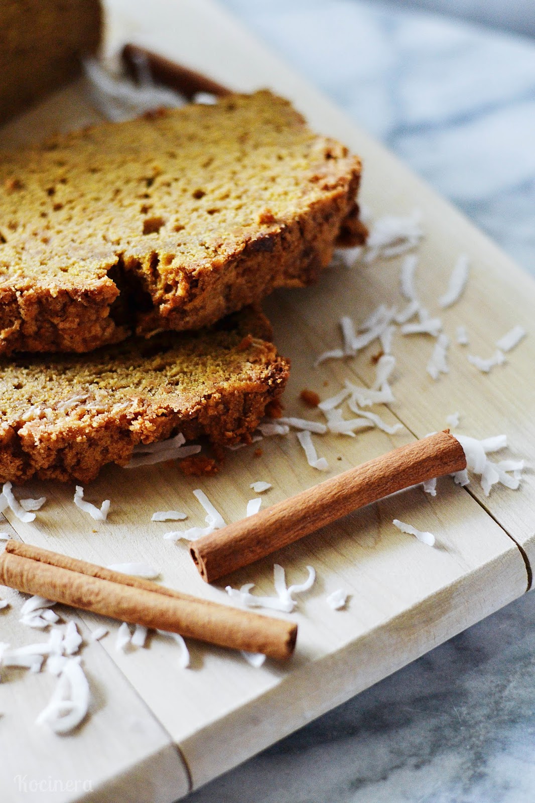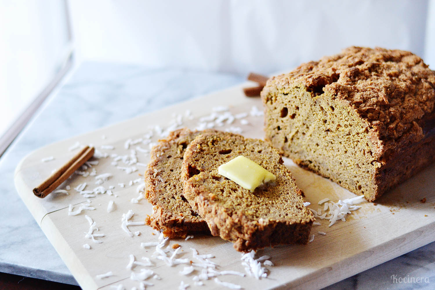 Aunque el tiempo aquí en Texas está todavía firmemente por las 90 grados (30° C), simplemente ya no puedo resistir a la repostería de calabaza. Ésta en particular resultó sorprendentemente bien, dada la inclusión un poco inesperada de coco. De verdad, nunca se escucha que la calabaza y el coco son una buena combinación, pero déjenme decirles, ¡es fenomenal! El pan todavía sabe completamente a un pan de calabaza rico y familiar. Es el aderezo crujiente por encima que hace que esta receta destaque. Sólo ese sabor a coco cada unos bocaditos hace que este pan sea un cambio refrescante de los viejos, sencillos (y todavía ricos) panes de calabaza del pasado.
